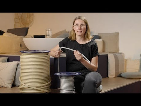 Technische Spezifikationen: Kern Dyneema® SK78 12-fach geflochten, Mantel 32-fach geflochten Polyester hochfest superflexibel, Farben Hellbeige, Silbergrau.