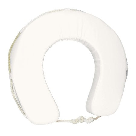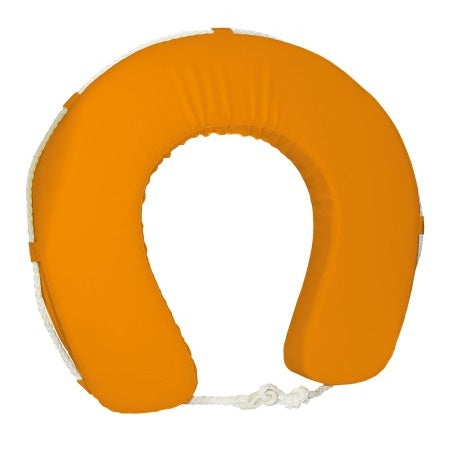 Technische Spezifikationen: Auftrieb > 100 N, Material PVC, UV-beständig, Abmessungen 550 x 480 x 100 mm, Innendurchmesser 250 mm, Innenöffnung 370 mm, Schutzhülle mit Reißverschluss, umlaufende Leine mit Nylon-Schnapphaken, Farben Orange/Weiß/Gelb.