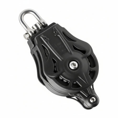 Der Wirbelschäkel ermöglicht eine flexible, drehbare Befestigung und verhindert Verdrehungen im Tauwerk, während der Hundsfott (Unterbügel) zusätzliche Montagemöglichkeiten bietet. Die zwei Scheiben sorgen für gute Kraftübersetzung und Effizienz beim Trimmen. Beide Lagertypen garantieren zuverlässigen Betrieb unter hoher Belastung.