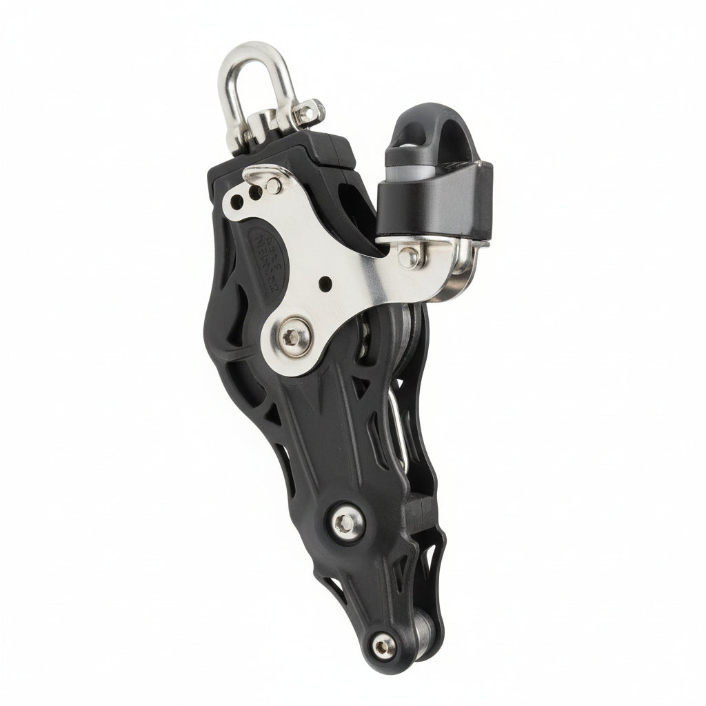 Hochbelastbarer Violinenblock von WICHARD mit praktischem Wirbelschäkel, stabilem U-Bügel (Hundsfott) und integrierter Klemme für vielseitige Befestigungsmöglichkeiten und sichere Leinenführung. Erhältlich in zwei Ausführungen – gleitgelagert oder kugelgelagert – für unterschiedliche Anforderungen. Ideal für anspruchsvolle Segelanwendungen, bei denen Zuverlässigkeit und Vielseitigkeit gefragt sind.
