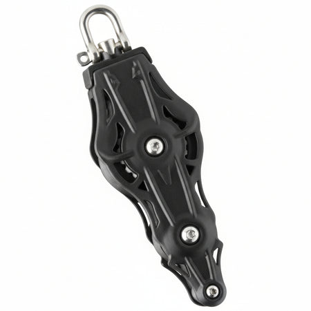 Der Wirbelschäkel ermöglicht eine flexible, drehbare Befestigung und verhindert Verdrehungen im Tauwerk, während der Hundsfott (Unterbügel) zusätzliche Montagemöglichkeiten bietet. Beide Lagertypen garantieren zuverlässigen Betrieb unter hoher Belastung.